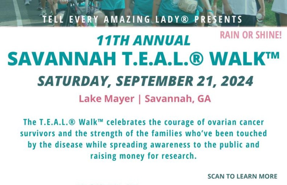 T.E.A.L.®, also known as Tell Every Amazing Lady About Ovarian Cancer Louisa M. McGregor Ovarian Cancer Foundation will be hosting our 11th Annual Savannah T.E.A.L.® Walk at Lake Mayer Park on Saturday, September 21, 2024.