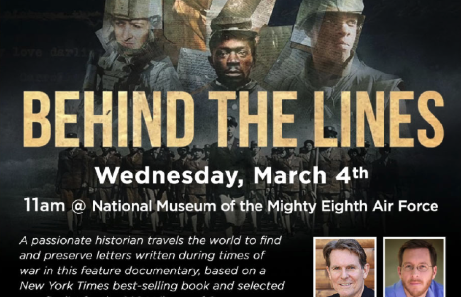 Behind the Lines Documentary Screening A film about the importance of letters during times of war. Wednesday, March 4th 11am at the National Museum of the Mighty Eighth Air Force The screening will be followed by a Q&A with film director and writer John B. Benitz and book author Andrew Carroll, the subject of the film. Click here to view the trailer The program is FREE to the public, but seating is limited so Please click here to register. About the film: A passionate historian travels the world to find and preserve letters written during times of war in this feature documentary, based on a New York Times best-selling book and selected as a finalist for the 2024 Library of Congress Lavine/Ken Burns Prize for Film. The Hindsight Film Festival, America's first major festival for historical documentaries, runs March 4th - 8th in Savannah. See our website for the full schedule, film guide and more Hindsight Film Festival.