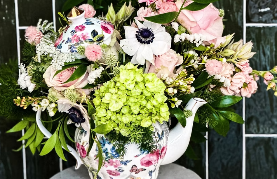 Create your own romantic flower arrangement inside a teapot vase—worthy of Lady Whistledown's attention—while enjoying tea service and scones in true garden party fashion.