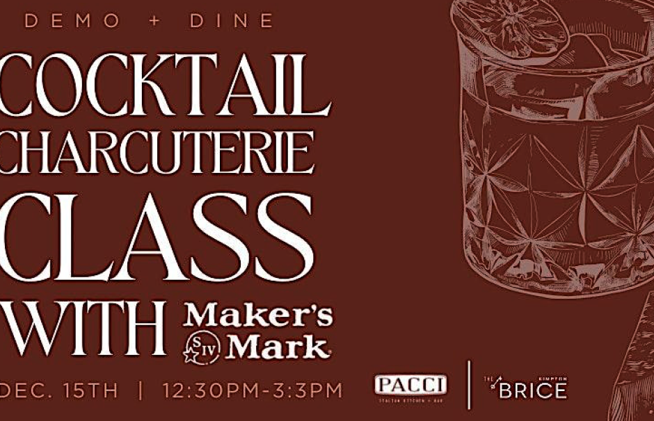 Join us with Executive Chef Andrew M. Gantt + our Bartender Brenden DeArman for a class on cocktails and charcuterie. LIVE DEMO 3 cocktails, while making your own and create meat roses, with the perfect pairing for display. Take pictures and WOW your in-laws this holiday season with your new skills.