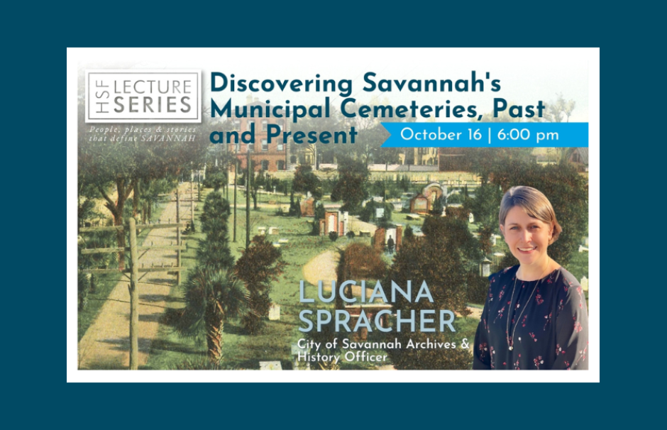In her HSF Lecture, Spracher will discuss the development of Savannah's public cemeteries and trace historic burial grounds through archival maps and records, sharing insight into the unique features that define Savannah's municipal cemeteries. Of the nearly 80 cemeteries located in Chatham County, the City of Savannah maintains six cemeteries, including Bonaventure, Colonial Park, Evergreen, Greenwich, Laurel Grove North and Laurel Grove South.