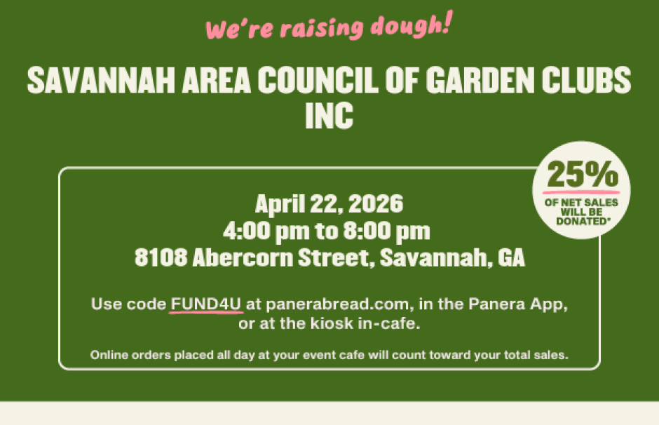 On Earth Day, Panera will donate 25% of all sales from 4 PM to 8 PM to support the Savannah Botanical Gardens.