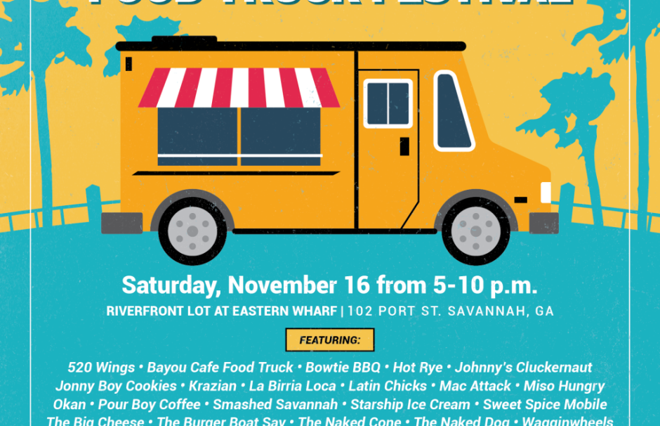 Join us for the inaugural Eastern Wharf Food Truck Festival on Saturday, November 16, from 5 to 10 p.m.! The festival will occur at the Riverfront Lot at Eastern Wharf, 102 Port St. in Savannah, GA.