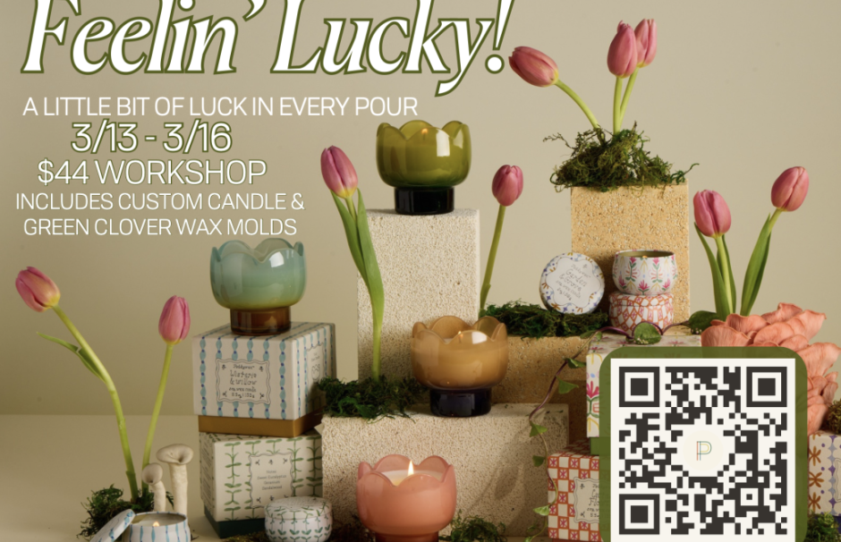 Celebrate St. Patrick's Weekend with a little luck and a lot of creativity at our $44 Candle Pouring Workshop, a festive nod to the lucky number "4." For just $44 per person, you will enjoy a hands-on experience creating your own custom candle using charming clover wax molds and vibrant wax dyes to design the perfect festive shade. Each guest will receive chocolate gold coins, a special Luck of the Draw pick from our pot of gold filled with discounts, free items, and other surprises, plus 20% off our retail selection for pouring with us. Grab your friends and join us for a fun, guided workshop that is perfect for beginners and seasoned candle lovers alike.
