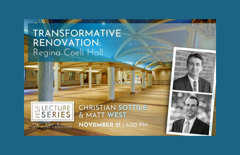 Historic Savannah Foundation (HSF) will host a special discussion about Transformative Renovation: Regina Coeli Hall on Thursday, November 21 at the HSF headquarters, located at 321 E. York St., as part of the 2024 Historic Savannah Foundation Lecture Series, People, Places and Stories That Define Savannah. Attendees are invited to a wine reception at 5:30 p.m. The lecture will start at 6 p.m.