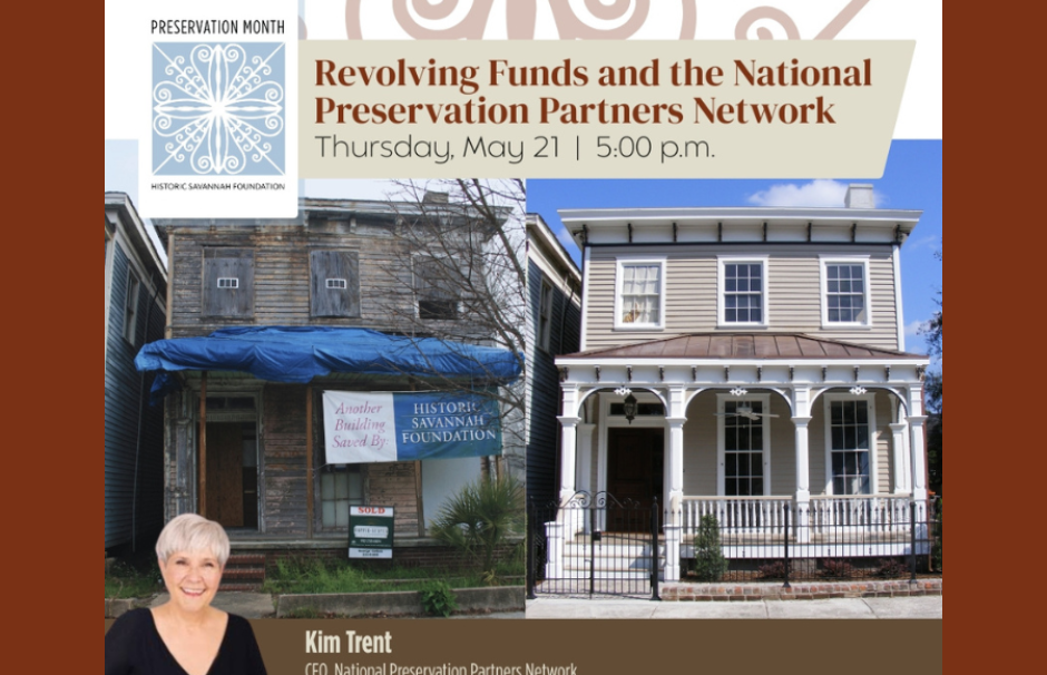 In honor of National Preservation Month, National Preservation Partners Network CEO Kim Trent will discuss how organizations across the country are implementing versions of Historic Savannah Foundation's Revolving Fund to save historic properties nationwide. Trent will also explain the impacts of Revolving Funds, compare their various models, missions, and goals, and share national preservation trends.