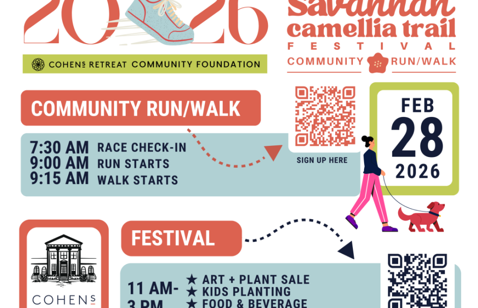 The Savannah Camellia Festival & Community Run invites runners, walkers, families, and neighbors to enjoy thousands of youth-planted camellias along the Truman Linear Trail, followed by a free, open-door festival at Cohen's Retreat with food, art, kids activities, and short demonstrations. The event includes a 5K run and a 1-2 mile community walk.