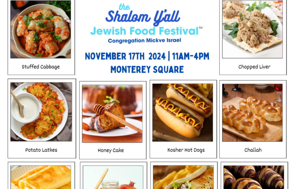 Congregation Mickve Israel invites the coastal community to the 34th annual Shalom Y'all Jewish Food Festival held again this year in Savannah's historic Monterey Square on Sunday, November 17th from 11:00 a.m. to 4:00 p.m.