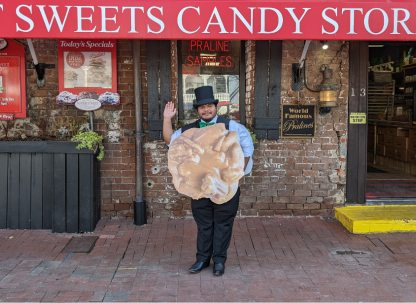 River Street Sweets welcomes guests with a complimentary warm praline sample. Enjoy the homemade treat while exploring the shop, which features a 100-year-old taffy-pulling machine stretching the nostalgic treats.