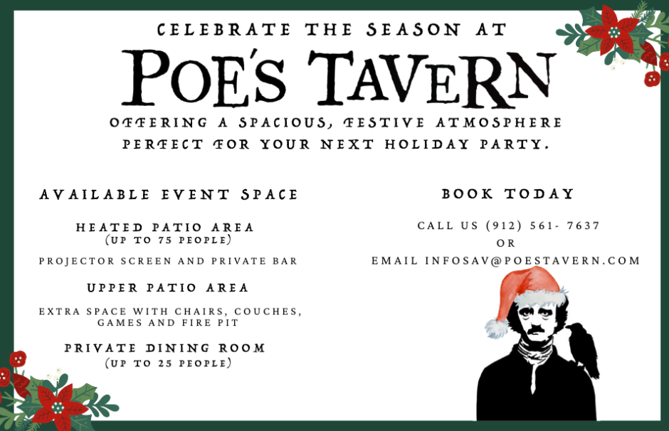 Poe's Tavern is the perfect spot to unwind with friends over a drink, enjoy a leisurely meal, or experience a memorable dining adventure in one of Savannah's most charming locales.