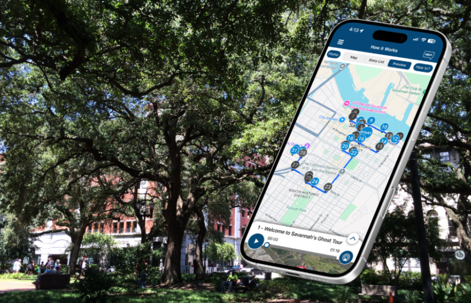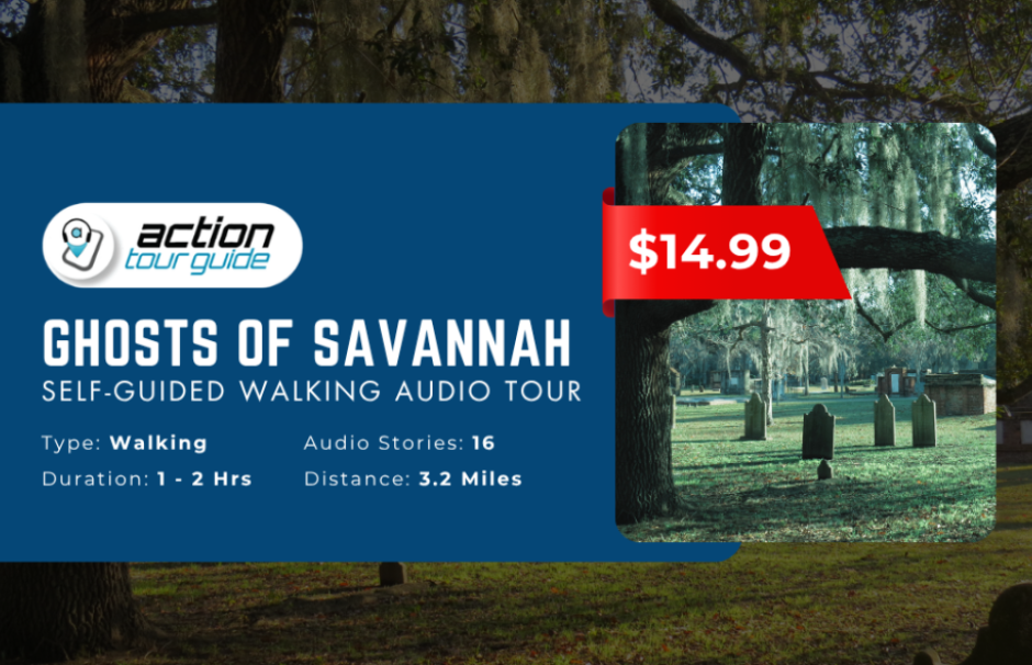 Start in Reynolds Square and let your phone guide the way. Over a 3.2-mile route, you’ll hear 16 GPS-triggered audio stories narrated by Mark Nesbitt, blending local legend, eyewitness accounts, and the real history that made Savannah famous for hauntings.