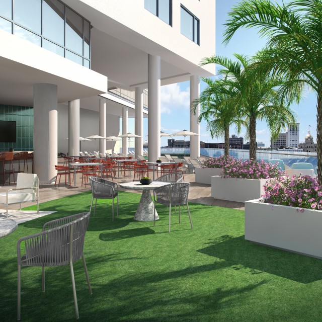 Grand Arrival Experience: A welcoming lobby with lush landscaping and architecture inspired by Savannah’s charm.