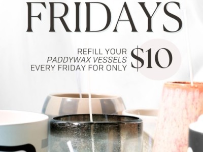 Paddywax Candle Bar invites guests to enjoy $10 Refill Friday every Friday. Bring in any clean, previously purchased…