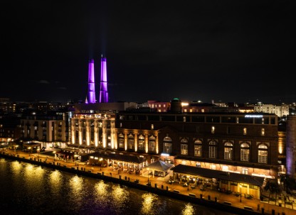 The site’s original 1912 power plant has been restored with the preservation of historic characteristics like the iconic twin smokestacks and brick exterior, and repurposed with the addition of hotel rooms and mixed-use space. Flanking either side are two new buildings, also featuring hotel rooms, restaurants, lounges, and meeting space. Along its shoreline, over a quarter-mile of riverwalk has been created.