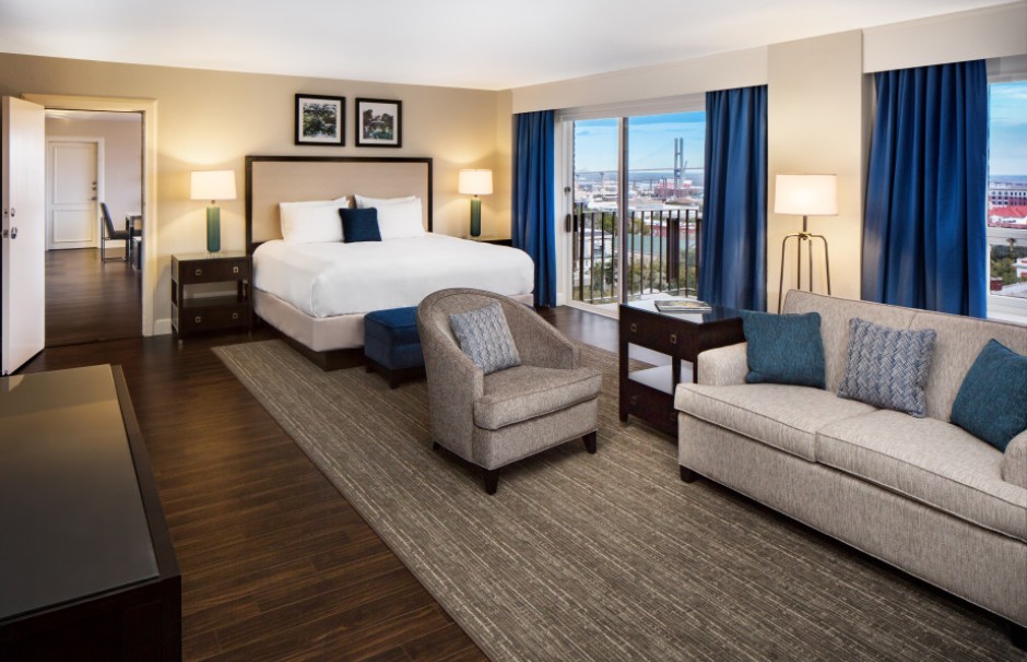 Offering unrivaled views of the Savannah skyline, our light and airy rooms and suites pair modern amenities with residential-style comforts, including upholstered headboards, down-filled duvets and pillows, and luxe cotton sheets. Soft neutrals mix with pops of maritime blue and shimmering finishes to create a stylish urban oasis in the heart of downtown Savannah. Marble and glass bathrooms feature plush towels, walk-in showers and premium amenities.